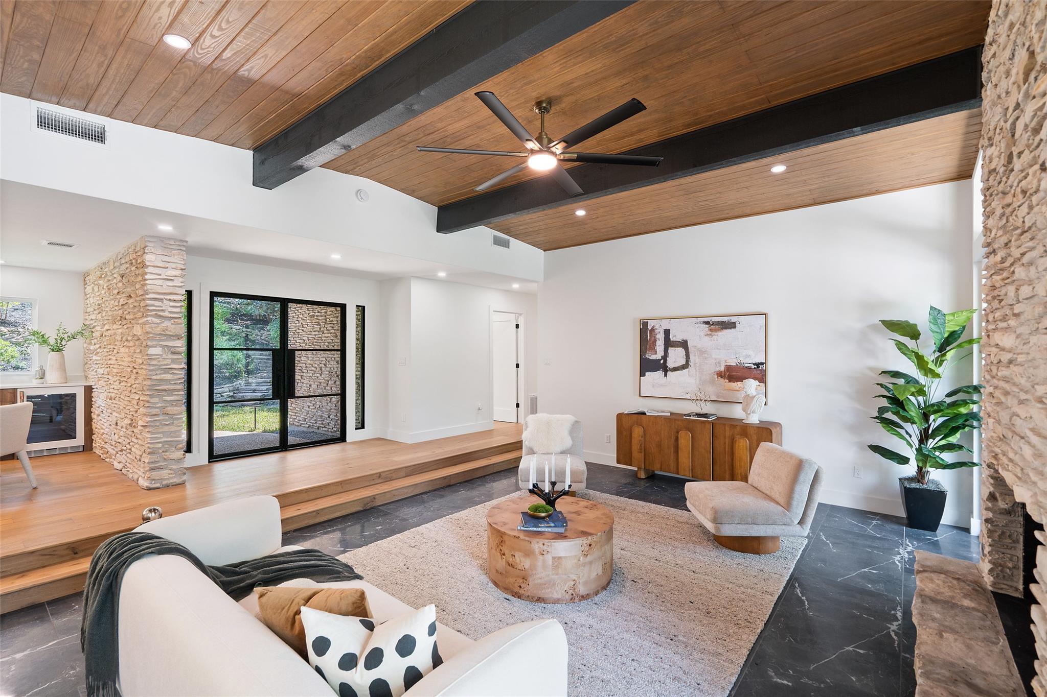 Inside, soaring ceilings and walls of picture windows invite the outdoors in, filling the open floor plan with natural light and framing stunning views of the treetops. Designer finishes balance elegance and comfort, from white oak engineered flooring and a hand-built stone fireplace to a custom quartz island with Smart Café Series and Bosch appliances, and marble-appointed baths. With 4 bedrooms, 2 living areas, and multiple skylights, the home feels both spacious and intimate.